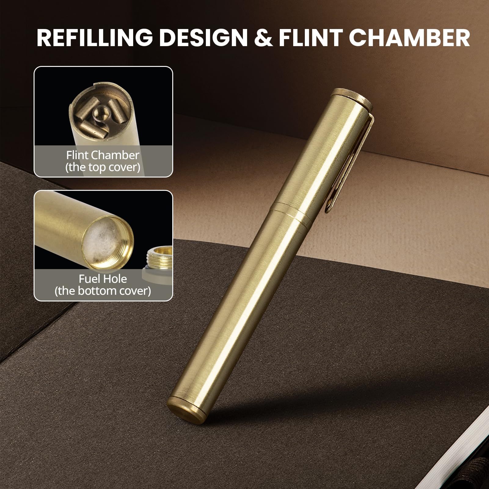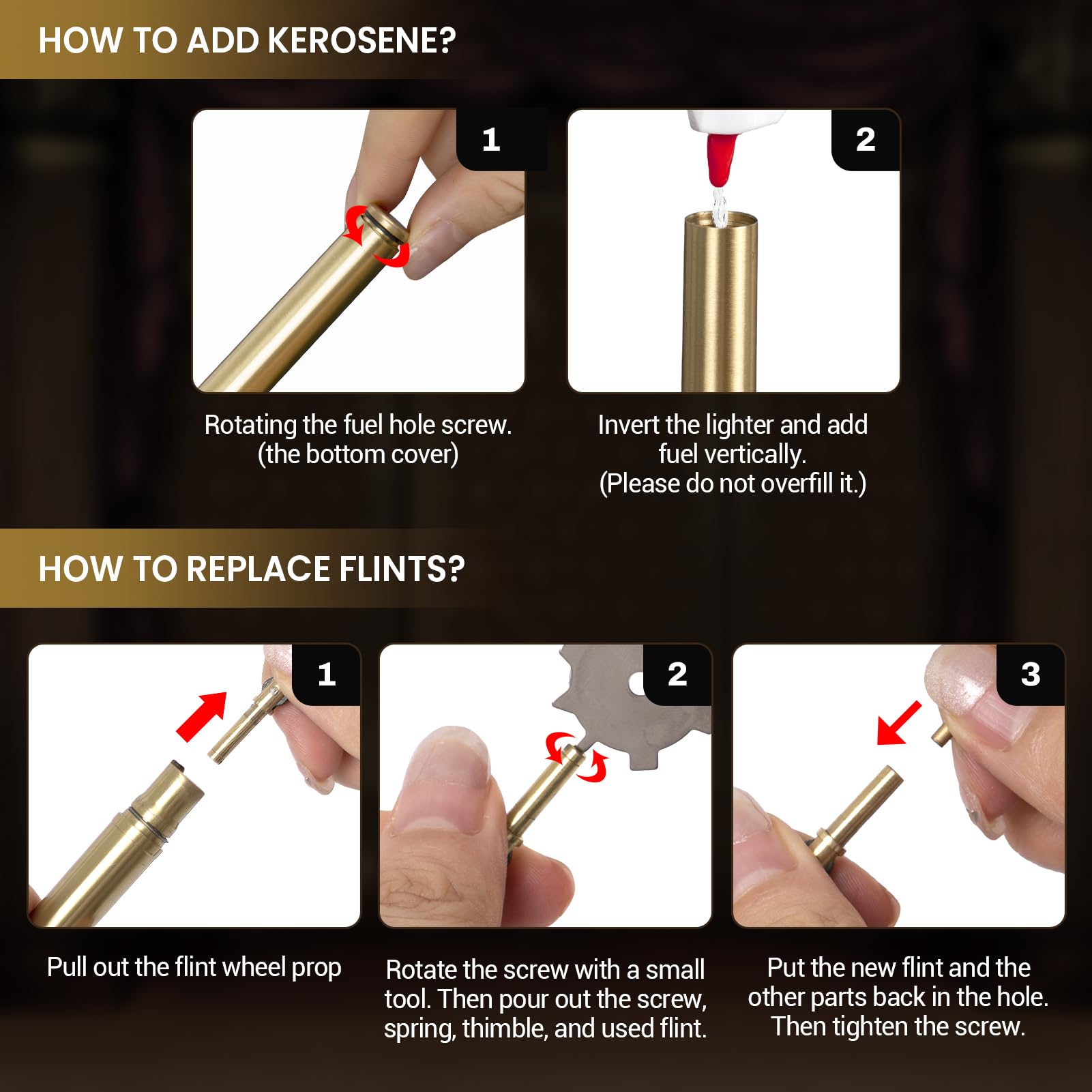 - REFILLABLE VINTAGE LIGHTER: Any standard type of lighter fluid and flint can be used, and the lighter fluid/fuel can be injected simply by turning the fuel tank lid. The use of leak-proof rubber O-ring, effectively prevent leakage and oil evaporation. NOTE: The bottom of the long section is to add kerosene and the short section is to change the flint! All vintage trench lighters are empty, so please fill fuel before the actual lighting